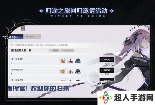 2、邀请码可重复使用,最多同时邀请10名玩家,受邀回归的指挥官在游戏中完成指定活跃任务,邀请指挥官可获得相应奖励。