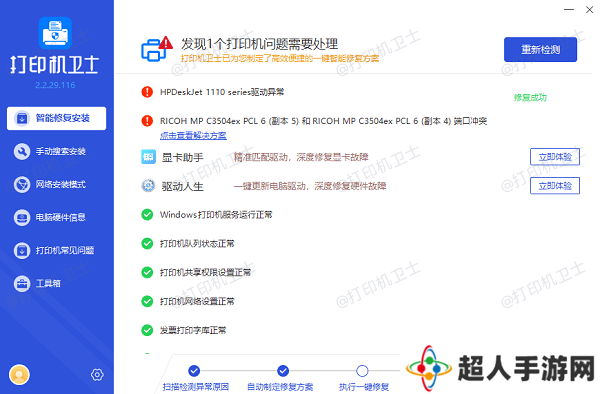 3、如果检测到打印机驱动异常,点击 “一键修复” 按钮,软件将自动下载并安装最新驱动。