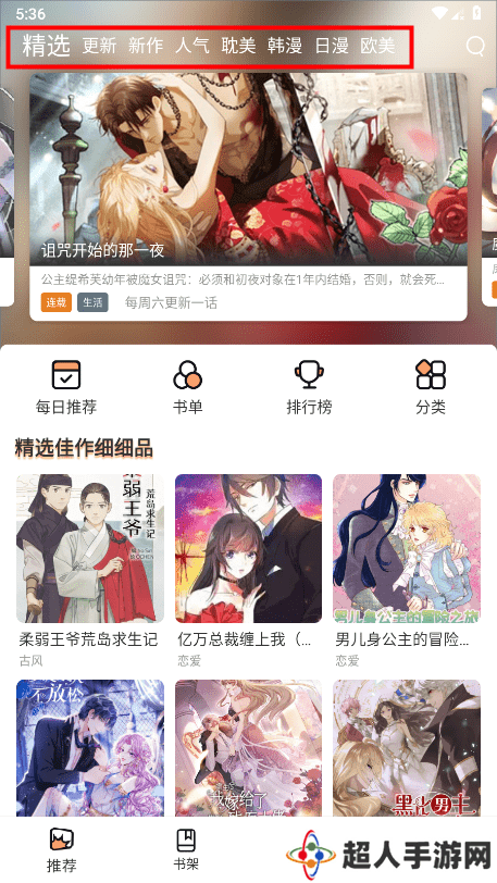 在app首页,我们可以看到精选、更新、新作、人气、耽美、韩漫、日漫、欧美等多个板块;
