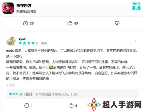 测试期间,各大平台都涌现了很多关于《掷在四方》的评论和内容:“这款游戏怎么能这么有意思”"我居然在一局游戏里体验了MOBA和自走棋的双重乐趣"。这款游戏既有烧脑的策略布局,又有超爽的团战输出,每个玩家都能在其中找到自己的乐趣。总之,就是一句话:一局不够,想玩第二局,第三局,一直玩下去!