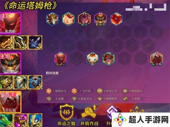2、羁绊组成:4命运之子 2咖啡甜心 2炎魔 2堡垒卫士 2强袭枪手 2学者