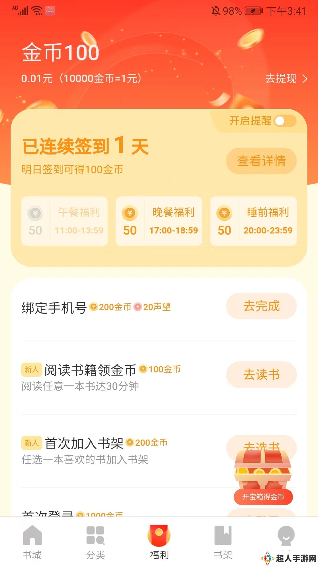 8、进入福利界面,完成签到、阅读、登录等任务后可以获得金币奖励,累积一定的金币后还可以进行提现,