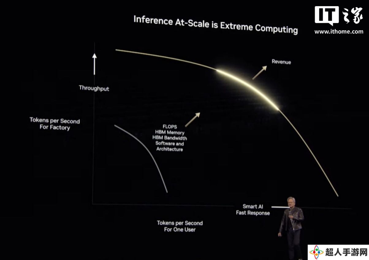 黄仁勋展示了一张关于推理的图表,X 轴显示用户每秒的 Token 数,Y 轴显示工厂每秒的 Token 数。
