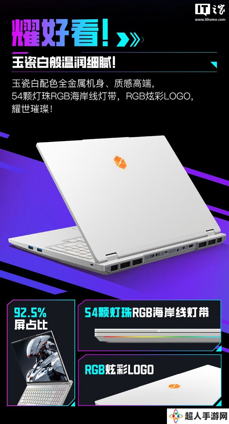 外观方面,该机整体采用“玉瓷白”配色全金属机身,拥有海岸线RGB LED灯带,其搭载具备单键RGB的 1.4mm键程剪刀脚键盘,配备微弧面人体工学键帽,触控板为AGC磨砂玻璃材质。