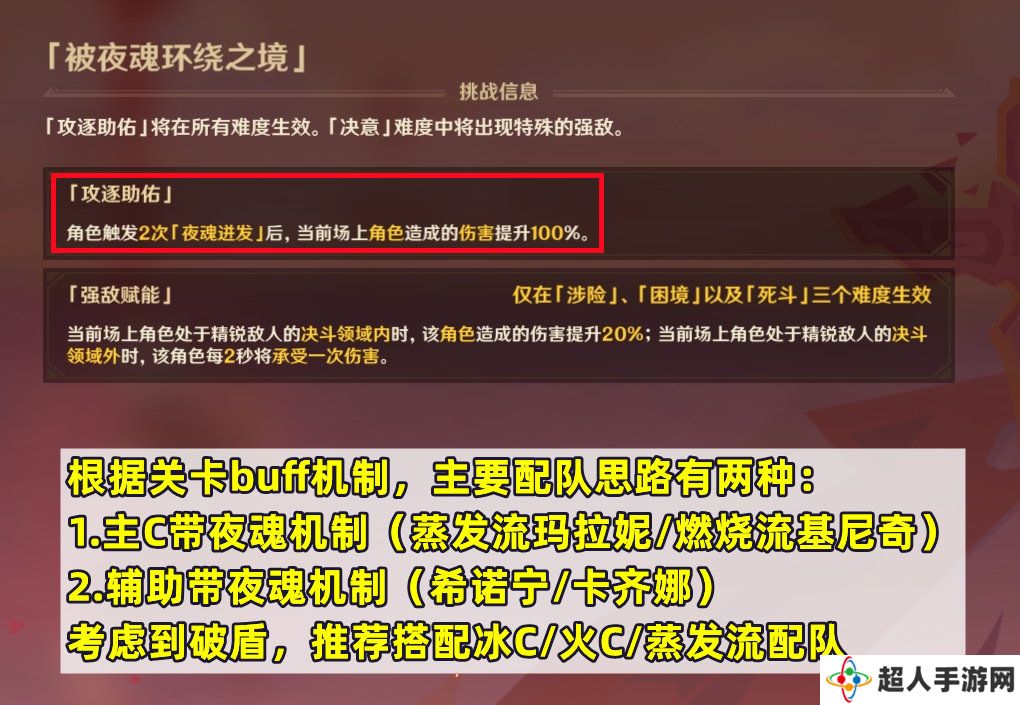 这一关的关键buff为触发两次夜魂迸发后,场上角色获得100%的增伤。