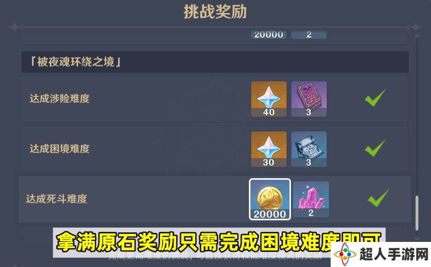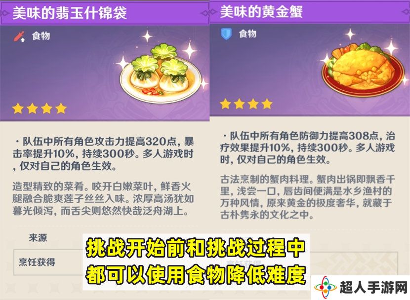 挑战开始前和挑战过程中都可以使用食物来降低难度;另外拿满原石奖励只需完成困境难度即可~