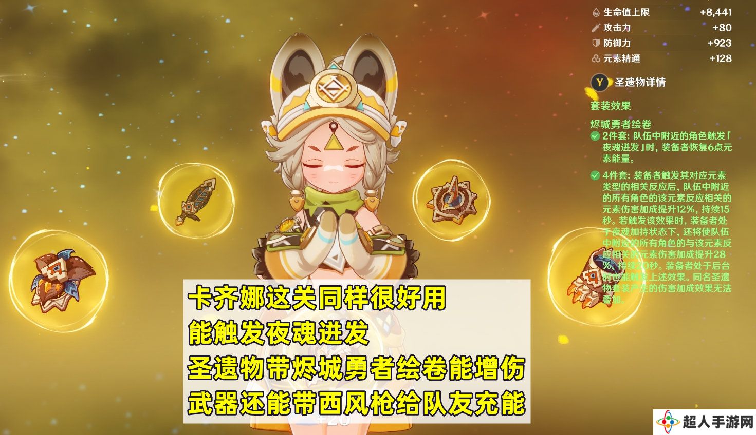 辅助带希诺宁或者卡齐娜。卡齐娜在这一关同样很好用,能触发夜魂迸发的同时,圣遗物带烬城勇者绘卷给队友增伤;