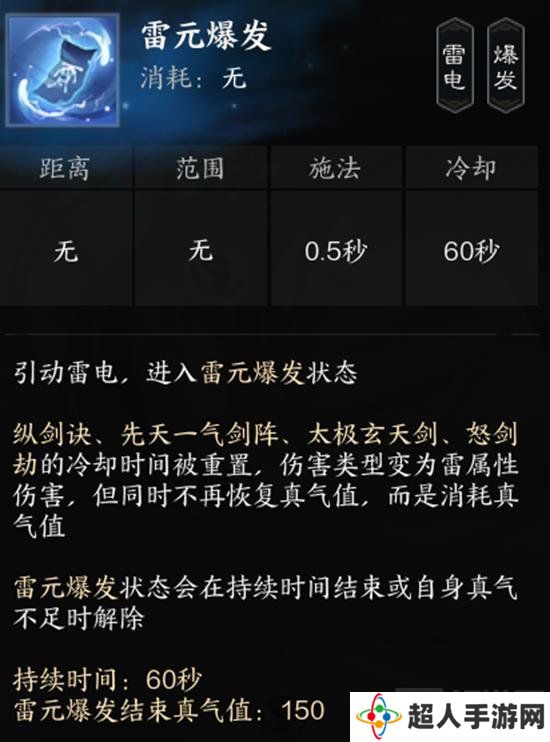 上路分支终极技能雷元爆发,进入【雷元爆发】状态,将填充技能冷却时间重置且转为雷属性伤害,但不再回复真气,而是消耗真气,真气不足150或达到持续时间60s后,退出【雷元爆发】状态冷却时间60s,处于【雷元爆发】状态时计入冷却时间。