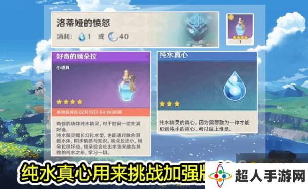 提到纯水精灵大家肯定想到了那个非常难打的精英BOSS,其实嫣朵拉就是那个BOSS的幼年体,而且前面提到完成嫣朵拉活动区域探索后可以获得水滴,这个水滴叫做纯水真心,可以用来挑战1.4版本中的新关卡洛蒂娅的愤怒,每次挑战消耗1滴纯水真心或者是40点体力,洛蒂娅的愤怒其实就是加强版纯水精灵,难度很大。