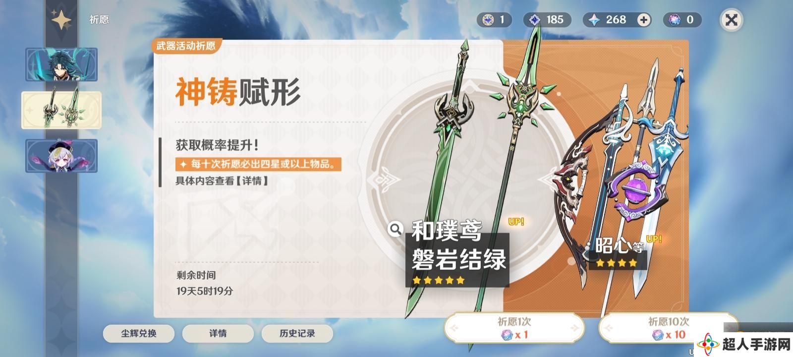 这期的武器UP池的五星武器分别有「和璞鸢·长柄武器」和「磐岩结绿·单手剑」。这两个武器都是它们各界的极品,磐岩结绿更是一件新武器,各位冒险家在抽到心仪的角色后还可以来武器UP池给他们抽一件武器。