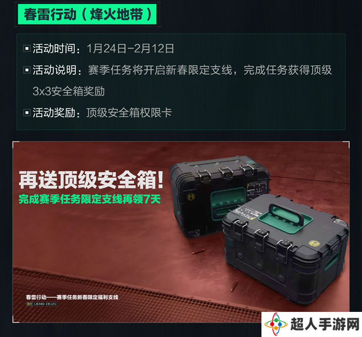 春雷行动(烽火地带):活动时间为1月24日-2月12日,赛季任务将开启新春限定支线,完成任务获得顶级3x3安全箱奖励,活动奖励为顶级安全箱权限卡。完成赛季任务限定支线再领7天。