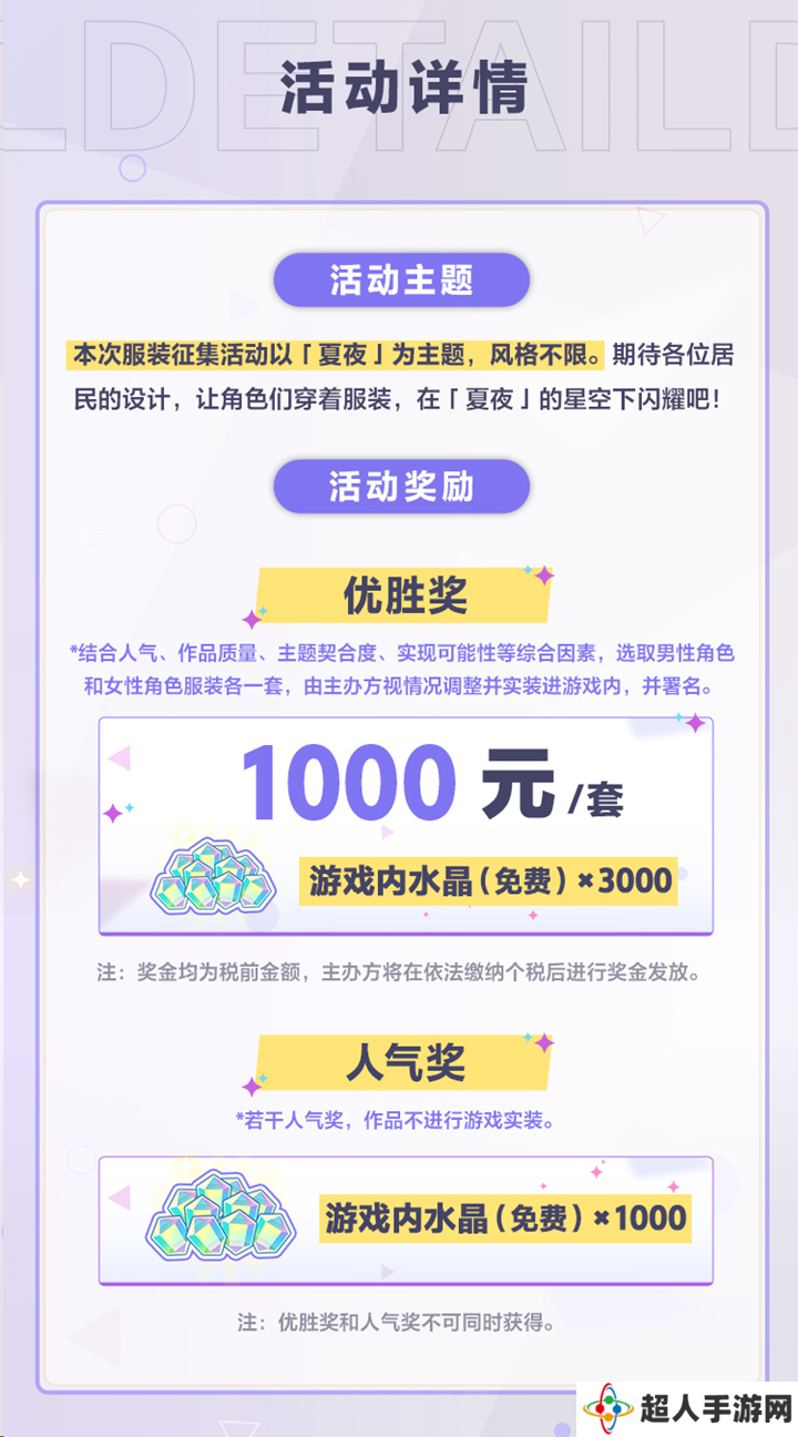 活动设有优胜奖和人气奖。优胜奖的奖励为1000元/套及游戏内水晶(免费)3000个,人气奖的奖励为游戏内水晶(免费)1000个。需要注意的是,优胜奖和人气奖不可同时获得。