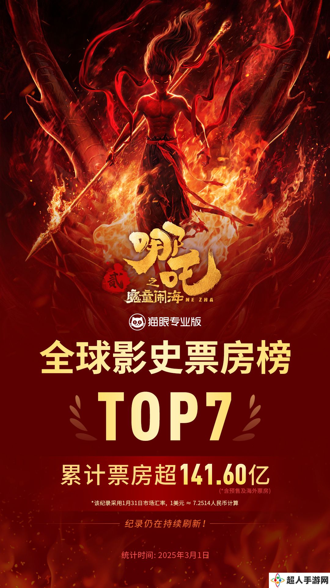 《哪吒之魔童闹海》全球票房破 141.60 亿,超《蜘蛛侠:英雄无归》跻身影史第七