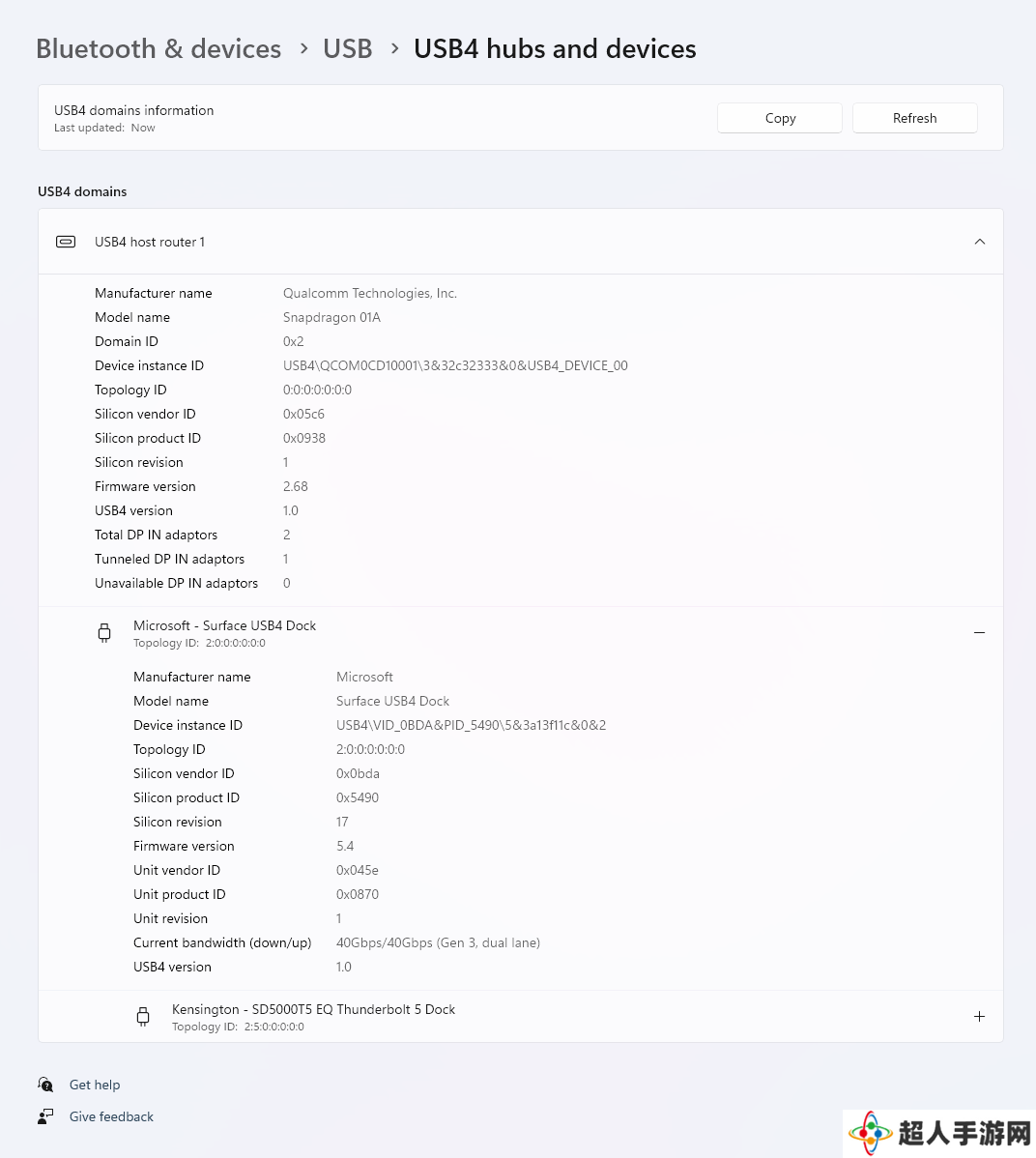 如果您的 PC 支持 USB4,则将可在设置中看到以下内容。此页面旨在让用户深入了解其系统和设备 / 拓展坞的 USB4 功能、协议支持详情,并为 IT 管理员和 / 或客户支持渠道提供故障排除支持:
