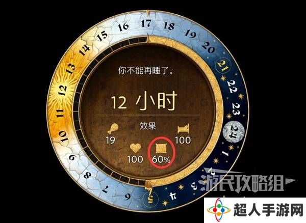 睡觉会推进时间,消除困倦恢复能量并疗伤回血,同时食物消耗也会加快,睡醒后一般要吃点东西补充营养。除了生命值、能量、营养这三项属性,下图圈出的标志是床铺的舒适度。
