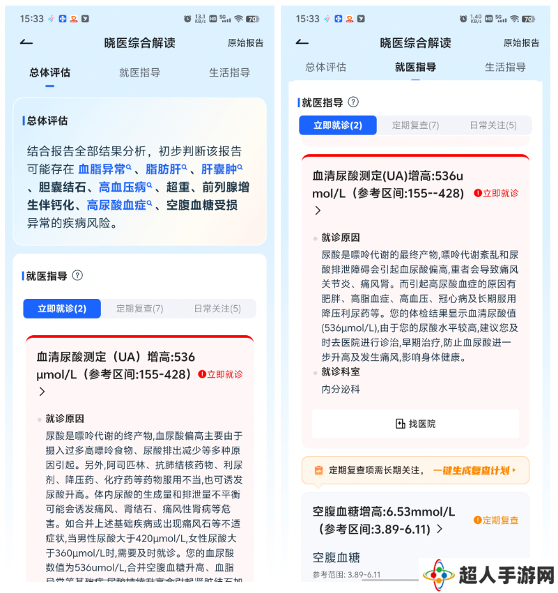 解读完成后,可以看到讯飞晓医给出的解读内容非常丰富,先是在总体评估中准确判断出报告中纯在的各项异常指标,然后又针对每一项异常指标进行医学原理解读和就医指导,在就医指导中又根据异常项目的严重情况区分了“立即就诊”、“定期复查”、“日常关注”三个类别,由于这部分内容很详细,小编截取其中片段供大家参考,不难发现呈现的方式很直观、细致,甚至指明了复查科室。