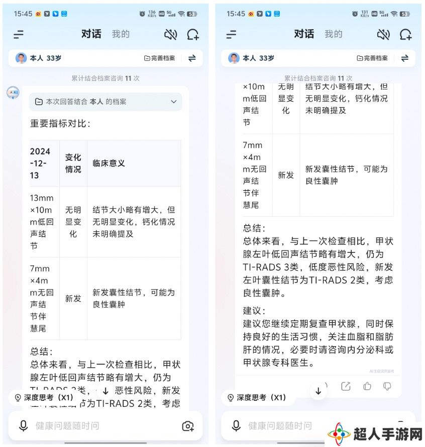 最后,小编上传了两年间不同时间拍摄的两张甲状腺彩超报告单照片,考验大模型能否根据多报告单进行时序对比解读。