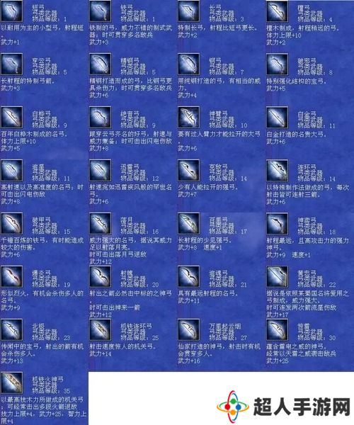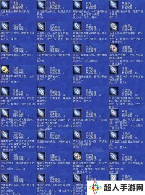 编号排序1、震雷青龙戟,编号:804。2、黄帝剑,编号:823。3、炼狱魔刀,编号:826。4、干将莫邪,编号:91。5、泰山府君杖,编号:112 。6、神鬼方天戟,编号:157。7、万胜丈八矛,编号:159。8、机铁火神弓,编号:111。9、天羽凤凰枪,编号:833。10、苍天帝剑,编号:850。三国群英传7的十大武器包括紫电、贲育、霸王枪、丈八蛇矛、方天画戟、青龙偃月刀、金龙连弩、雌雄双股剑、凤凰羽扇和青虹剑等。这些武器都有着不同的属性和效果,可以为玩家提供极大的帮助和支持。每个武器都具有独特的性质和功效。例如,紫电可以增加攻击力和射程,贲育则可以增加闪避和格挡率。霸王枪可以增加攻击力和暴击率,丈八蛇矛则可以增加攻击范围和穿透力。方天画戟可以增加攻击力和攻击距离,青龙偃月刀可以增加攻击力和暴击率,金龙连弩可以增加攻击速度和射程,雌雄双股剑可以增加攻击力和格挡率,凤凰羽扇则可以增加攻击力和攻击距离。青虹剑是一把全能的武器,可以同时增加攻击力、防御力和移动速度等属性。另外,想要获得这些十大武器并不容易,需要玩家在游戏中完成各种任务、挑战和探索。有些武器甚至需要从BOSS或其他特殊场景中获取。因此,玩家需要耐心地积累经验并不断提升自己的实力,才能有机会获得这些顶级武器。其次,每个武器的属性和效果都是不同的,需要根据不同的需求和游戏情况选择相应的武器。例如,长枪可以增加攻击距离和攻击范围,而大刀则可以增加攻击力和暴击率。铁斧则可以增加打断和撞击效果,弓箭则可以增加攻击速度和射程等。另外,玩家还可以通过购买、探索、任务奖励等多种方式获得各种类型和品级的武器。在游戏中,一些重要的任务和剧情中也会出现与武器相关的线索或提示,玩家需要认真阅读说明和对话,探索相关地点,寻找符合条件的武器,并按照游戏设定的要求完成任务。三国群英传7武器大全 全武器编号属性与技能剑类大全:42 干将莫邪 剑 等级40 武力+22 智力+10 体力+35 技力+35 速度+1 忠诚+16 分身斩 神剑闪华 莲花轰天 泰山压顶 黄龙天翔 军魂 诅咒 横斩前排三人43 草剃 剑 等级30 武力+17 智力+1 体力+10 技力+10 忠诚+10 分身斩 月轮烈光斩 食尸鬼阵 九尾妖狐 借尸还魂 童子降临 姬降临 倭国三神器44 冰凰炎凤 剑 等级29 武力+16 体力+8 技力+8 忠诚+12 八方斩 水龙狂涛 火龙怒焰 全面补强 结构破坏 迅雷 附加火焰/冰冻攻击45 仁义无双 剑 等级29 武力+17 智力+1 体力+10 技力+10 忠诚+12 八方斩 黄龙天翔 夺气术 通天之眼 绝地之眼 王道恢复体力46 寒铁双股剑 剑 等级28 武力+16 智力+1 体力+5 技力+5 忠诚+12 八方斩 夺气术 通天之眼 横斩前排三人47 巨阙剑 剑 等级28 武力+16 体力+10 忠诚+10 八卦斩 地龙极震 天剑神威 杀气 霸道巨剑48 魑魅魍魉 剑 等级28 武力+16 体力+10 邪灵妖刃 食尸鬼阵 魔灵刀兵 借尸还魂 尸魂 吸收敌人体力49 逆天剑 剑 等级28 武力+17 体力+5 技力+5 忠诚+12 分身斩 神剑闪华 月轮烈光斩 天灯照影 端正军纪 王道 加倍伤害50 倚天剑 剑 等级27 武力+14 体力+10 忠诚+10 分身斩 神剑闪华 增加经验 古代的神剑,有君临天下的气势51 虎牙剑 剑 等级26 武力+15 体力+10 忠诚+10 噬血魔刃 地龙震 御飞刀 杀气 凶残之剑52 皇天怒 剑 等级25 武力+15 忠诚+10 八方斩 破城神鎚 月轮烈光斩 局部破坏 大范围劈斩53 飞星 剑 等级24 武力+13 智力+1 速度+2 忠诚+12 天剑神威 神剑闪华 假传待命 迅捷非常之剑54 流采 剑 等级24 武力+14 智力+1 忠诚+12 天剑神威 假传冲锋 贯穿一人55 华铤 剑 等级24 武力+14 智力+1 忠诚+12 神剑闪华 端正军纪 加倍伤58 方土 剑 等级23 武力+14 忠诚+12 地龙极震 挪移阵 大略侦察 较强劈斩59 东极 剑 等级23 武力+15 体力+5 技力+5 忠诚+12 铁轮血斩阵 土遁隐杀 挪移** 大略清野 四极神兵60 破山剑 剑 等级22 武力+13 忠诚+10 地龙 天剑斩 土遁隐杀 拨云见日 斩岩破石的宝剑61 青釭剑 剑 等级22 武力+12 忠诚+10 三圣华斩 神剑闪华 铁轮血斩阵 天狗吞日 绝世名剑62 白虹 剑 等级22 武力+12 忠诚+10 四方斩暴击贯穿一人63 紫电 剑 等级22 武力+12 忠诚+10 雷击闪 浮雷 召引天雷杀敌64 辟邪 剑 等级22 武力+12 体力+10 技力+10 忠诚+10 四方斩 风龙 冲阵消除 驱邪除妖的神剑65 流星 剑 等级22 武力+11 忠诚+10 四方斩 水龙 大略清野66 青冥 剑 等级22 武力+11 智力+5 技力+30 忠诚+10 四方斩 地龙 冲阵消除67 百里 剑 等级22 武力+12 速度+2 忠诚+10 四方斩 火龙 大略侦察68 村正 剑 等级21 武力+11 技力+5 忠诚+9 地狱之门 隐忍镖 铁轮血斩 霜雪覆地69 古碇刀 剑 等级21 武力+11 体力+5 忠诚+9 御飞刀 三日月斩 半月斩 风云变色70 流光 剑 等级20 武力+11 体力+5 技力+5 忠诚+9 剑轮舞 三日月斩 贯穿72 太一 剑 等级17 武力+11 体力+10 忠诚+8 神剑闪 三日月斩73 凄然 剑 等级17 武力+11 智力+2 技力+5 忠诚+8 生死门 浑元一气75 风云斩 剑 等级15 武力+10 忠诚+7 旋风 地泉冲 三连斩 神兵,较强劈斩77 龟纹 剑 等级15 武力+11 体力+5 忠诚+7 化气炉 二连斩 护身78 火精 剑 等级15 武力+11 忠诚+7 赤焰燃 火焰攻击82 思召 剑 等级10 武力+8 智力+1 忠诚+5 三连斩 神兵,较强劈斩