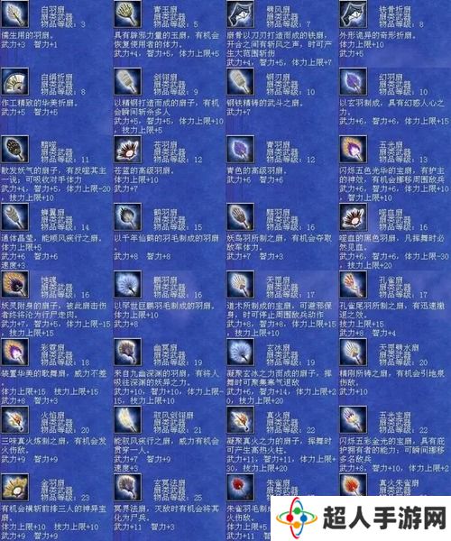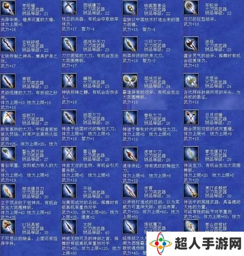 刀类大全:111 翔龙偃月刀 大刀 等级30 武力+21 体力+25 技力+10 忠诚+15 月轮烈光斩 神鬼乱舞 黄龙天翔 八方斩 破城神鎚 增我将攻 冲阵破坏 破城 大范围劈斩112 青龙偃月刀 大刀 等级29 武力+20 体力+20 技力+5 忠诚+13 月轮烈光斩 神鬼乱舞 黄龙天翔 增我将攻 大范围劈斩113 雷公鞭 大刀 等级28 武力+19 体力+5 技力+5 忠诚+13 浮雷阵 五雷轰顶 雷光焦狱 局部破坏 铁壁 引天雷杀敌114 虎贲大刀 大刀 等级28 武力+19 体力+8 技力+8 忠诚+13 月轮烈光斩 刚牙巨虎 紧急补强115 日月双锤 大刀 等级27 武力+18 体力+5 技力+8 忠诚+12 剑轮斩 八卦六角阵 挪移阵 紧急清野116 鳌头两刃斧 大刀 等级27 武力+19 体力+5 技力+5 忠诚+12 剑轮斩 三圣华斩 破城巨鎚 紧急侦察117 战国大刀 大刀 等级26 武力+18 智力+1 体力+5 技力+8 忠诚+12 邪灵妖刃 破城巨鎚 简易补强118 春秋大刀 大刀 等级26 武力+19 体力+5 忠诚+12 噬血魔刃 天剑开光 快速破坏119 混沌双斧 大刀 等级24 武力+18 忠诚+11 地龙震 五岳华斩 灭敌将攻 大范围劈斩120 天罡斧 大刀 等级24 武力+18 忠诚+11 五雷轰顶 雷光焦狱 气疗121 混沌开天刀 大刀 等级23 武力+17 忠诚+10 火龙焰 巨木妖尸 压制杀气 狂击 大范围劈斩122 三环大刀 大刀 等级23 武力+18 智力-3 忠诚+10 风龙旋 地龙震 压制杀气123 波母 大刀 等级23 武力+18 忠诚+10 五岳华斩 混元一气 匿踪潜行恢复体力124 南极 大刀 等级23 武力+18 体力+10 技力+10 速度+2 忠诚+10 火龙怒焰 挪移阵 假传冲锋 拆招125 编驹 大刀 等级23 武力+18 忠诚+10 水龙狂涛 七星灯 天灯照影224 UJ大鸡腿 大刀 等级20 武力+5 智力+5 体力+30 技力+30 速度+1 恢复体力