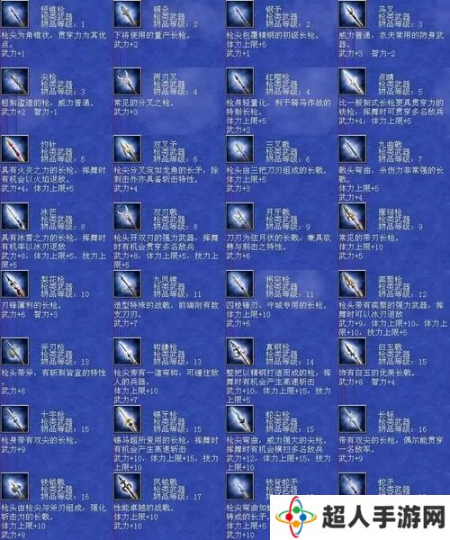 枪类大全:157 神鬼方天戟 枪 等级 31 武力+19 体力+10 技力+10 速度+2 忠诚+13 飞鬼戟 神鬼乱舞 大地狂啸 五岳华斩 泰山压顶 封武将技 绝地之眼 斗志 大范围挥斩158 方天画戟 枪 等级30 武力+18 体力+5 技力+5 速度+1 忠诚+12 飞鬼戟 神鬼乱舞 大地狂啸 五岳华斩 封武将技 大范围挥斩159 万胜丈八矛 枪 等级 30 武力+19 体力+45 忠诚+13 长枪突击 铁骑突击 突剑四方 八卦突斩 夺气术 加速急气 通天之眼 刚体 同时重伤两名敌人160 丈八蛇矛 枪 等级29 武力+17 体力+30 忠诚+12 长枪突击 铁骑突击 突剑四方 八卦突斩 加速急气 一骑当千161 九天龙魂贯 枪 等级 30 武力+18 智力+5 体力+15 技力+15 忠诚+13 火龙怒焰 炎兽杀阵 八方斩 八卦突斩 混元一气阵 掩地之幕 蔽天之幕 斗志 贯穿四人162 龙胆枪 枪 等级 29 武力+16 智力+3 体力+10 技力+10 忠诚+12 火龙怒焰 炎兽杀阵 八方斩 八卦突斩 万法自然163 霸王凤凰枪 枪 等级 30 武力+18 体力+25 技力+20 忠诚+13 水龙狂涛 神鬼乱舞 五岳华斩 八卦突斩 七星续命灯 冲阵尽灭 封武将技飞马 贯穿四人164 凤凰枪 枪 等级 29 武力+17 智力+4 体力+5 技力+5 忠诚+11 水龙狂涛 神鬼乱舞 五岳华斩 八卦突斩 冲阵破坏 封武将技 横斩前排三人165 虎贲方天戟 枪 等级 27 武力+17 忠诚+11 分身斩 刚牙巨虎 魔灵枪兵 八卦斩 稳定军心 同时击伤多人166 神龙戈 枪 等级 26 武力+17 忠诚+11 地龙极震 水龙狂涛 火龙怒焰 风龙天旋 横斩前排三人167 破军蒺藜枪 枪 等级 25 武力+17 体力+15 忠诚+11 八方斩 魔灵枪兵 解除封技168 青天钩镰枪 枪 等级 25 武力+17 体力+10 忠诚+11 剑轮斩 月刃烈斩 灭敌军防169 西极 枪 等级 23 武力+15 体力+5 技力+5 忠诚+11 八卦四方阵 移气术 全面补强 技回 横斩前排三人170 不周 枪 等级 23 武力+15 体力+10 忠诚+11 幽冥鬼骑 挪移** 结构破坏179 铁脊蛇矛 枪 等级18 武力+10 体力+5 忠诚+8 地龙 剑轮舞