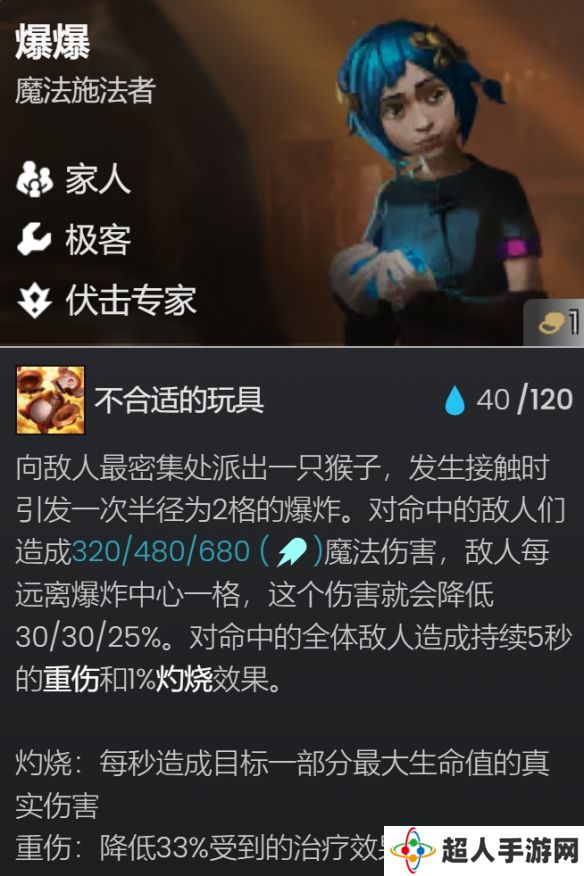 技能:释放追踪的炸弹猴。因为这个猴子还需要跑一段路才能打出伤害,正常局难当主C,可以在德莱文体系中当副C。