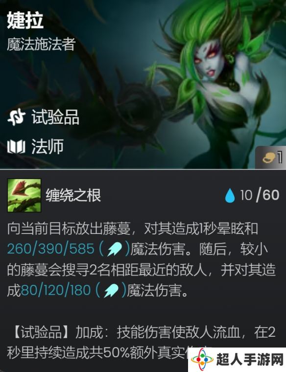 技能:先是释放藤蔓对目标单体的控制,之后分裂2个小藤蔓造成额外伤害。