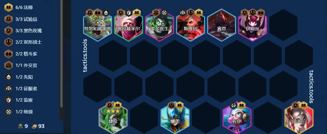 速D三星婕拉,中期靠3试验品2法师2格斗过度,后期大成3试验品6法师3黑色玫瑰。