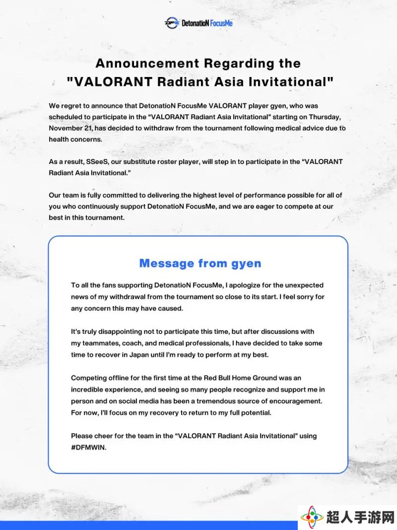 原文大意如下:很遗憾,由于健康问题,gyen选手将退出即将开始的源能亚洲邀请赛,SSeeS将顶替gyen参加。我们整个团队会全身心投入,尽全力打出最高级别的发挥,以回报一直支持我们的粉丝们,期待能在比赛上展现出我们全部的实力。